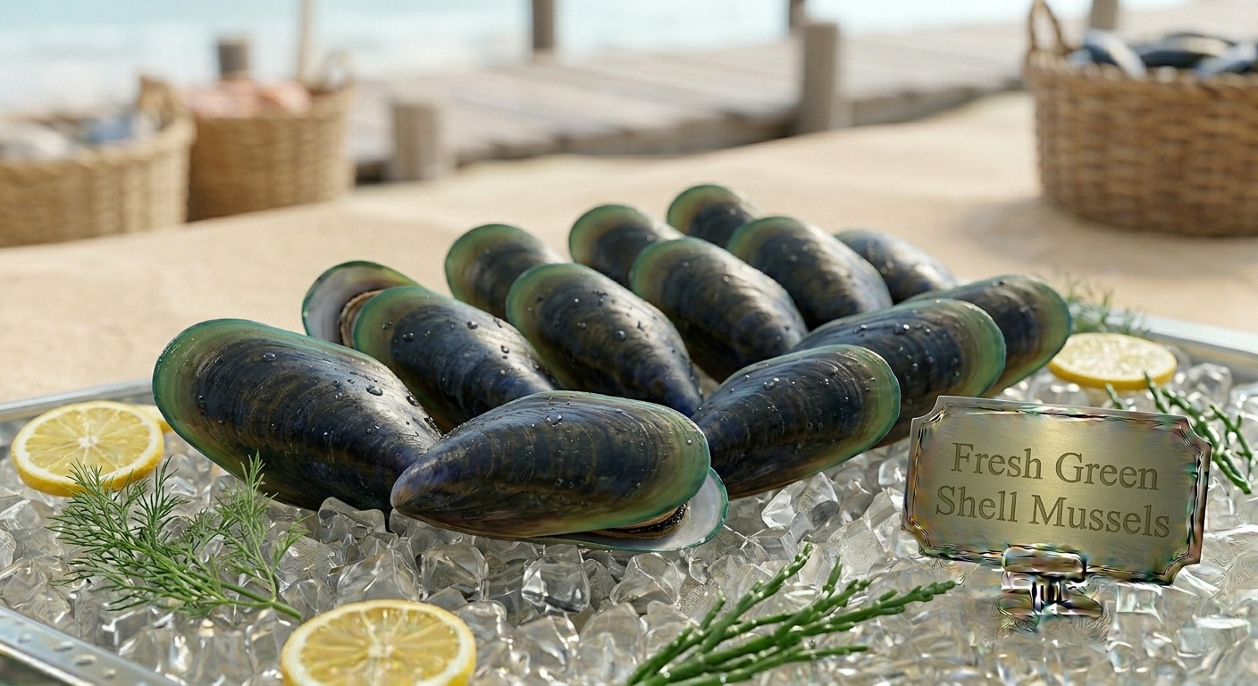 Green shell mussels UAE, scientifically Perna viridis, belong to the Mytilidae family. Locally called محار القشرة الخضراء, they inhabit nutrient rich coastal waters and estuaries (FAO Area 57). Characterized by glossy green shells, firm orange flesh, and a slightly sweet, oceanic flavor, these mussels are ideal for steaming, grilling, or preparing UAE dishes such as Machboos and Sayadieh. Appearance markers include clear eyes, red gills, and shiny shells, ensuring freshness and quality. The half shell format simplifies cooking for Friday family meals and festive occasions.