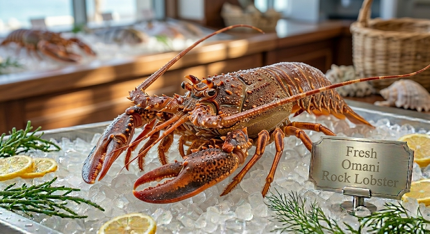 The Omani Rock Lobster (Panulirus homarus), locally revered as جراد البحر العماني, belongs to the Palinuridae family. Unlike its Atlantic cousins, the Rock Lobster is “clawless,” concentrating its prized, firm meat within a thick, muscular tail. These lobsters thrive in the rocky reef habitats of the Arabian Sea, specifically within FAO Fishing Area 51.